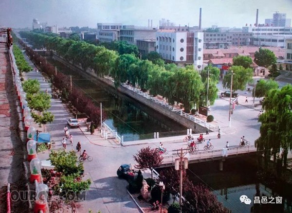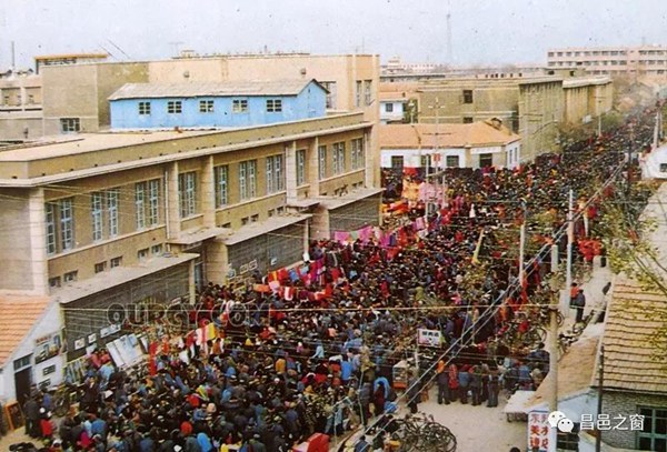 随着利民街的贯通和百货大楼的启用,昌邑大集核心贸易区逐渐挪到利民街上,从石渠路到解放路段成为昌邑大集最热闹的一段。上图:从利民街石渠桥头往东拍摄的昌邑大集,近处大楼是粮食局,中间水塔院子是粮油加工厂旧址,粮油加工厂东邻是服务楼和昌邑饭店。