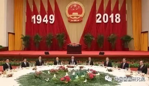 人民大会堂宴会厅华灯璀璨,鲜花绽放,洋溢着喜庆热烈的气氛。主席台上方高悬庄严的国徽,“1949—2018”的大字年号在鲜艳的红旗映衬下格外醒目。