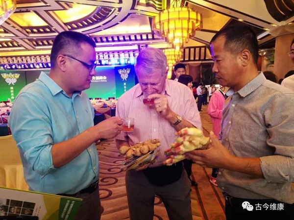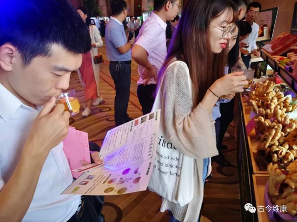 来宾们在品尝“毅硕”品牌系列中草药养生茶品