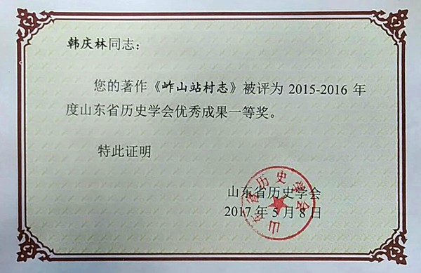 近日,我市宣传系统退休干部韩庆林先生收到了山东省历史学会寄来的荣誉证书,他的著作《岞山站村志》一书被评为2015-2016年度山东省历史学会优秀成果一等奖。