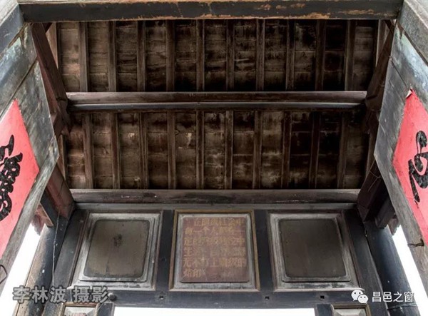 北屋前窗全部是四扇玻璃窗,向外开。屋门是双层:外层两扇木制镶玻璃门,向外开;内层四扇折叠木板门,靠门边两扇窄,中间两扇宽,内开,开启后靠在墙上不占空间。进得门来,迎面是木隔断,悬挂着当地名画家范春晖的梅、兰、竹、菊、牡丹、莲花六条屏绢质工笔画。