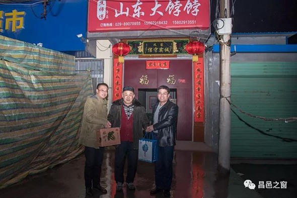 孙建华(祖籍昌邑孙家上疃)为了给老娘烙饼吃跑回山东的大集上买了鏊子,正是从那个老家的鏊子开始,他成了当地有名的山东大饼王,开起了“山东大饼”饭店。最感人的是他在饭店里设了一个“昌邑县”雅间,凡事山东老家来人,他都热情地邀请来这里吃饭。(上图是2016年春节我们过来走访时拍的)
