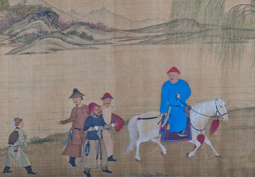 另外,山东青州博物馆藏有清佚名《李煦四季行乐图》卷,画心长六五九厘米,宽六〇厘米,从右向左,依次为春夏秋冬四景。主人公的年纪大约五六十岁。如果这一推测不致大谬,那么它的绘制,当在以上诸作之后。而2014年北京匡时所拍《李煦行乐图卷》(周道、上睿合绘版)有确切落款:“乙亥(1695)冬日吴门周道写照。”是年李煦四十一岁。