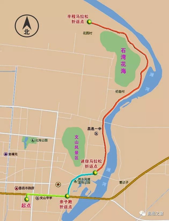 迷你马拉松:出发点(昌邑市文化中心)→沿平安街向东→滨河西路向北→折返点(交通街大桥西首)→原路返回终点;