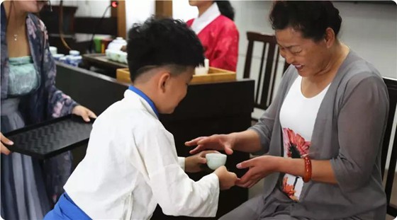 欣赏完茶艺表演之后,每位小朋友都向自己的家长献茶一杯。茶水清冽,恩情厚重。