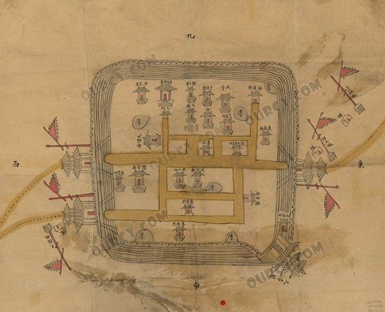 该〈莱州府昌邑县城垣图〉背面以黄纸封裱,图题则以红签题署于其上;原为官署呈送本。全图未附比例、图例,但有座标,其方位北为上方,标示于图上方。
