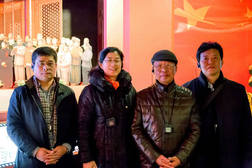 昌邑作协一行三人与张笑天主席摄于长影博物馆《开国大典》展台前