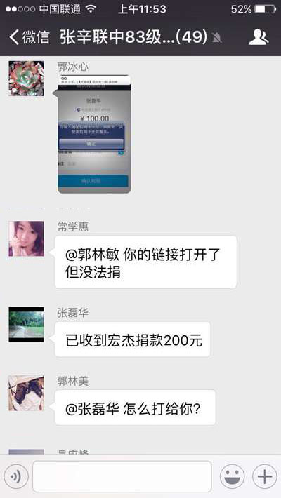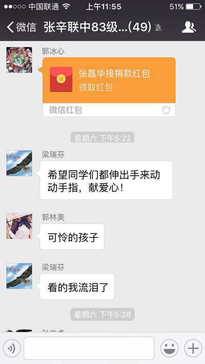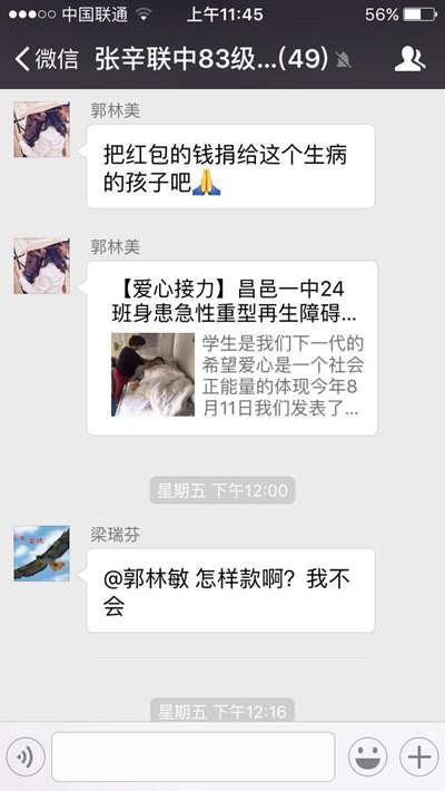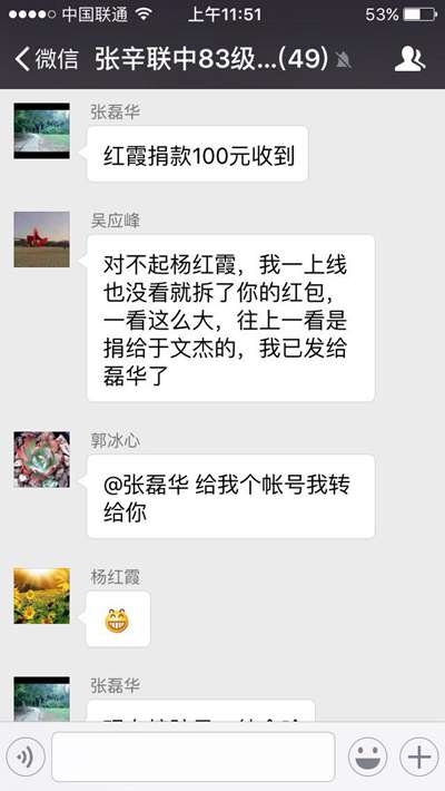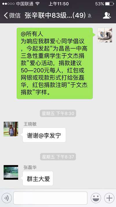 奎聚街道沟崖村的张晓敏女士把于文杰同学的遭遇,发到了原张辛联众83级同学群里。同学们看到后纷纷呼吁发起捐款,并在群里发布公告,倡议同学们积极献出一份爱心,帮助于文杰同学战胜病魔。两天时间,该同学群捐助爱心款叁千元整,并转送到昌邑一中有关科室。