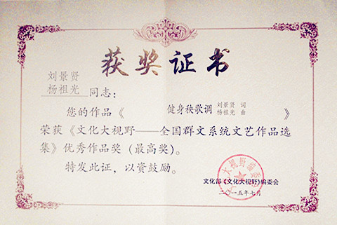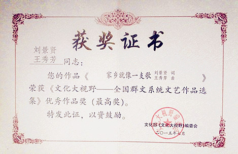 由文化部全国公共文化发展中心主编的《文化大视野__全国群文系统文艺作品选集》第7卷,已由中国文联出版社正式出版发行,我市刘景贤同志作词的歌曲《家乡就像一支歌》(王秀芳曲)、《健身秧歌调》(杨祖光曲)被收入作品选并双获优秀文艺作品最高奖。该奖项为我市首次获得。