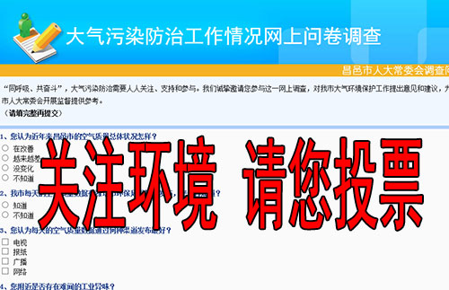 “同呼吸、共奋斗”,大气污染防治需要人人关注、支持和参与。我们诚挚邀请您参与这一网上调查,对我市大气环境保护工作提出意见和建议,为市人大常委会开展监督提供切实参考数据。该次问卷调查从7月11日起,7月25日结束。点击如下链接即可进入投票页面。