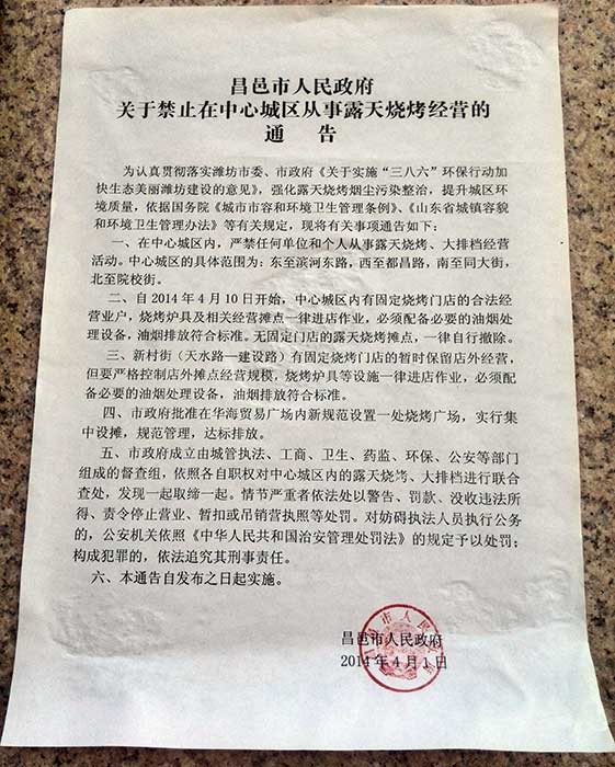 昌邑市人民政府关于禁止在中心城区从事露天烧烤经营的通告
