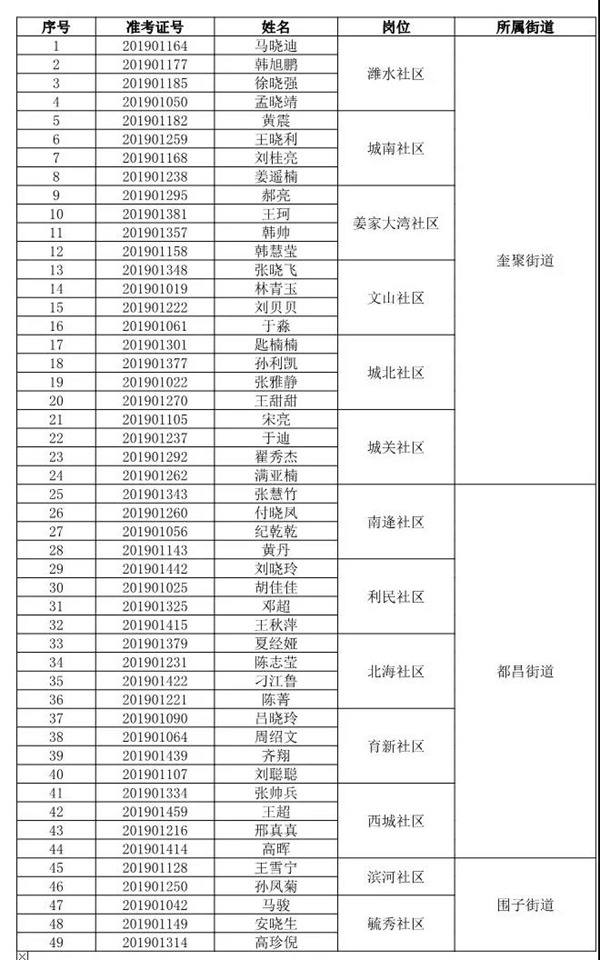 公示:2019年昌邑市城市社区专职工作人员招聘选岗名单