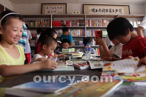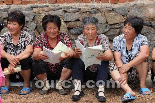 几位大妈挤不进新建的图书干,干脆拿了我们捐赠的《潍河文艺》蹲在墙角看