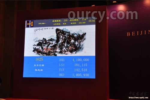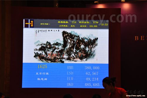 拍卖会上,1625号拍品陈忠洲《夏日行旅图》以30万元起拍价开拍,开拍后迅速叫到38万。经过10几轮叫价,最终以110万元人民币落槌,作品被浙江某大型企业拍得。此幅作品尺寸为136*48厘米,创造了陈忠洲山水作品成交价新高。
