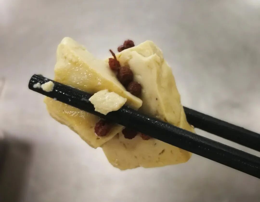 确实,这豆腐看着朴素,吃起来却有讲究 —— 刚入口是淡淡的咸,嚼两下就有黄豆的清甜冒出来,花椒的麻味不冲,只在舌尖轻轻绕一圈,最后咽下去时,卤汁的香味还黏在唇齿间。