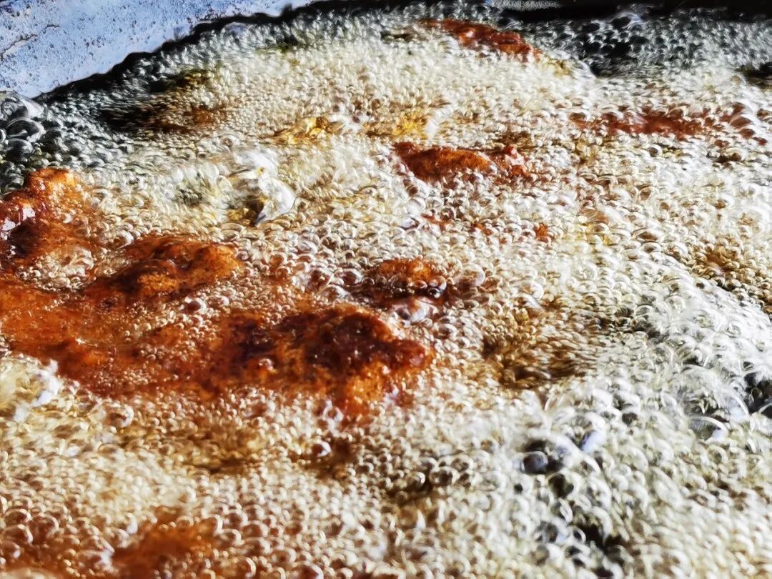 炸制的过程,更是考验火候的功夫,老潍县人管这叫“火候定乾坤”。锅中倒入足量的花生油,烧至六成热时,将腌制好的肉片下锅炸制。肉片下锅的瞬间,“滋啦”一声,油花四溅,像炸开的烟火,瞬间唤醒了整个街巷的香气。