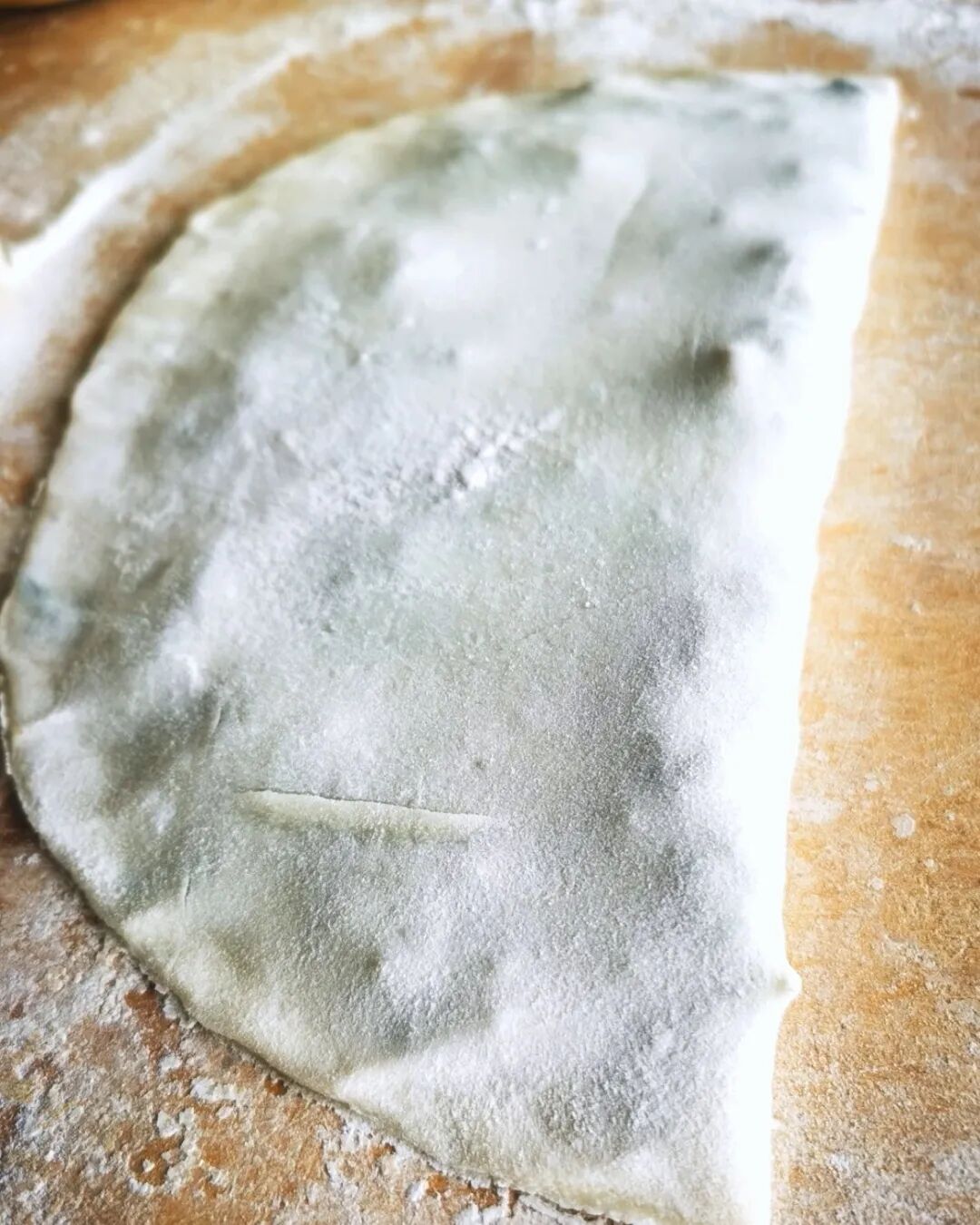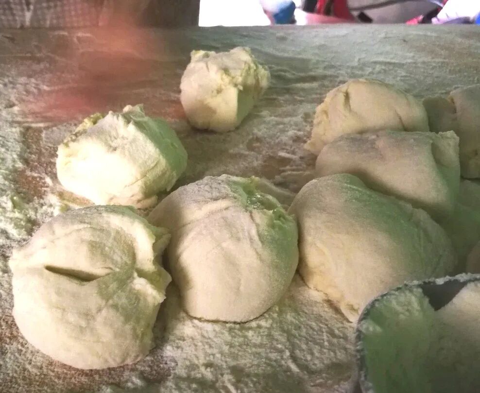 做韭菜哈饼,讲究的是家常手法,全凭经验与手感。醒好的面团分成小剂子,擀成薄薄的圆饼,舀上满满一勺韭菜鸡蛋馅,铺得均匀厚实,再盖上另一张面饼,边缘捏得紧实,防止烙制的时候馅料漏出。
