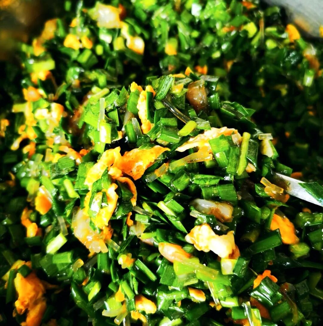 哈饼的馅料向来随性,家里有什么时令蔬菜,都能切碎了拌进去,白菜、菠菜、西葫芦,甚至是虾皮鸡蛋,各有各的风味,可在所有馅料里,能称得上绝配、能把哈饼的灵魂彻底唤醒的,永远是韭菜,尤其是春日里刚冒头的春韭,那股子鲜灵劲儿,是任何食材都比不了的。
