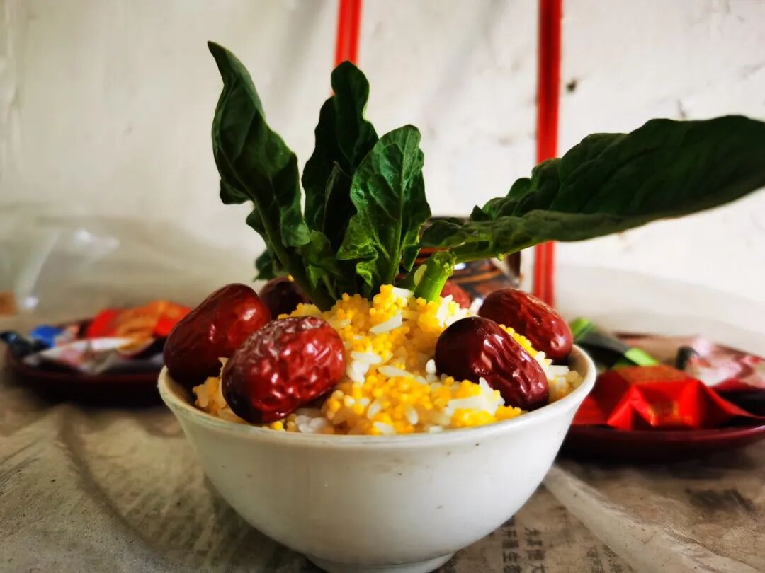 捞好的黄米,温热软糯,粒粒金黄,被郑重地盛入洁净的供碗之中,一碗碗摆得满满当当,堆出圆润的尖儿,这是 “岁岁圆满,五谷丰登” 的寓意,愿新的一年,日子过得圆圆满满,仓廪充实,衣食无忧。供碗的黄米中央,要稳稳插上一棵带根的菠菜,菠菜的根须完整,茎叶鲜绿,直直挺立在黄米之中,这便是老辈人最看重的讲究 ——根脉相承,子孙兴旺。