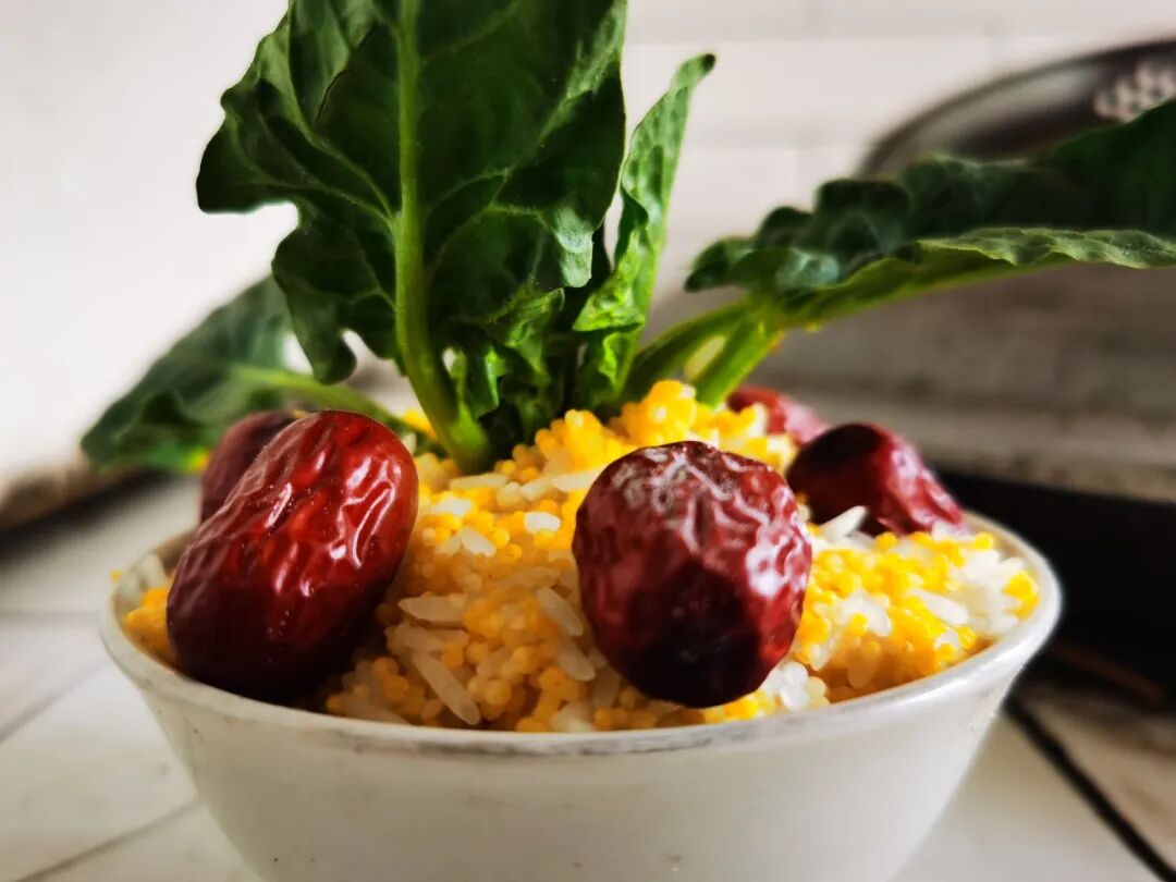 而后,再在金黄的黄米上,摁上几颗煮得软糯香甜的红枣,红的枣,黄的米,相映成趣,红是喜庆的年色,黄是丰收的光景,红枣寓意 “红红火火,甜甜蜜蜜”,黄米寓意 “金玉满堂,岁岁安康”,一颗红枣一颗心,一碗黄米一份情,这份搭配,是最朴素的美好,也是最真挚的祈愿。