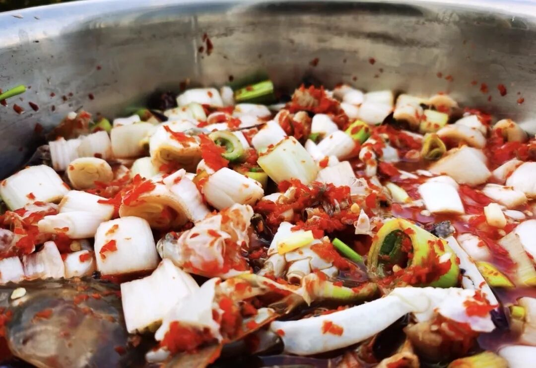 漫长的冬日里,酱坛在室外静静发酵,大葱辣椒的鲜辣与蟹酱的醇香相互交融,五六天后便可食用了。