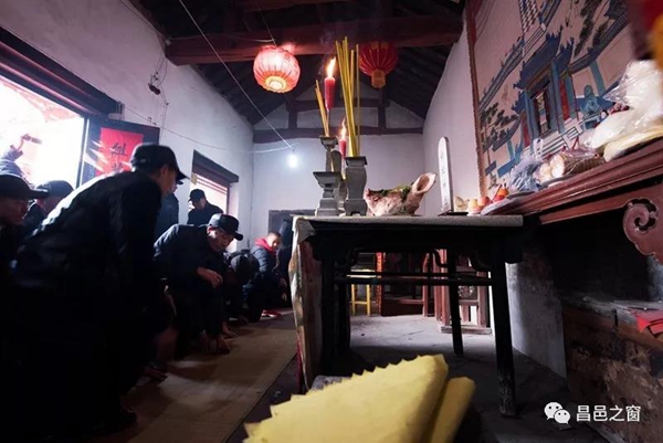 族长进入大堂,打香,烧纸,磕头拜祖。