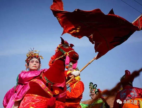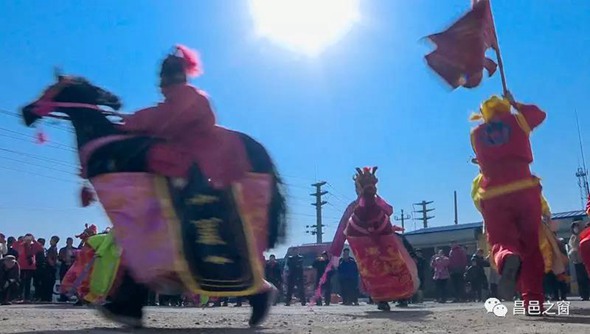 女骑手则头戴珠宝玉翠,面搽脂粉,身穿红绿缎袄,系古代闺秀打扮。 队伍的最前面,有一青年挑着一面“马”字大旗,为马队旗号。