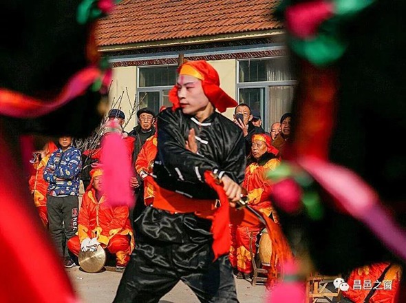 接着便是武术队的化装武士,其中 4人抛马叉,2人滚马叉,2 人耍单刀,2人舞动双刀,2人耍拐子枪,2人耍梢子棍,20人 肩扛红缨扎枪,另有挥舞钢鞭和绳鞭者若干人。