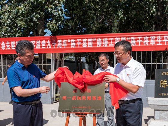 陈干墓园及生平陈列馆被列入“潍坊市统一战线教育基地”,潍坊市委统战部副部长于来刚与昌邑市委常委、办公室主任刘煜为“潍坊市统一战线教育基地”揭牌。