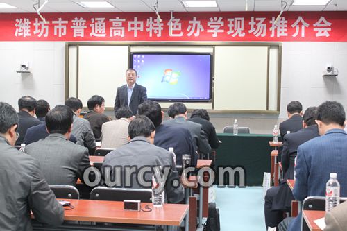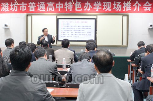 10月18日上午,潍坊市普通高中办学特色现场推介会在昌邑一中综合楼四楼录播教室召开。来自潍坊市各县市区教育局的分管局长、基教科科长和全市三星级及以上普通高中校长及昌邑一中全体领导干部、首席班主任、团总支书记和教师共150余人参加了会议。
